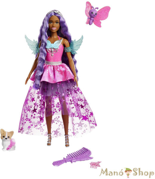 keltse életre a tündérmesék varázslatát a barbie brooklyn babával!Lépjen be a Barbie A Touch of Magic varázslatos világába ezzel a gyönyörű Brooklyn babával, amelyet egyenesen a népszerű Netflix sorozat ihletett! A gyerekek most nemcsak a képernyőn követhetik a kalandokat, hanem a saját szobájukban is megeleveníthetik a legkedvesebb jeleneteket, vagy teljesen új, fantasztikus történeteket találhatnak ki. Brooklyn baba egy igazán tündéri jelenség. Extra hosszú, kb. 18 cm-es lila haja arra vár, hogy a kis fodrászok csodálatos frizurákat készítsenek belőle a mellékelt fésű, fejpánt és hajcsat segítségével. A hajformázás nemcsak szórakoztató, de a finommotoros készségeket is fejleszti. A baba öltözéke is a mágiát idézi: egy csillogó, többrétegű ruhát visel, melynek felsőrészét szárny-motívumok, hosszú tüllszoknyáját pedig csillagok díszítik. A megjelenést a felcsatolható, csillogó tündérszárnyak teszik teljessé, amelyekkel Brooklyn készen áll a repülésre a fantázia birodalmában. A kalandokból a barátok sem maradhatnak ki! A csomagban két imádnivaló kisállat is helyet kapott: egy cuki pillangó és egy tütüt viselő kiskutya. Ők hűséges társai lesznek Brooklyn babának minden varázslatos utazás során, gazdagítva a szerepjáték élményét. Ez a Barbie baba tökéletes ajándék minden gyermek számára, aki rajong a tündérmesékért és a kreatív játékokért. A játék során fejlődik a fantázia, a kommunikációs készség és a kreativitás, miközben a gyerekek a barátságról és a kalandokról szőhetnek meséket. Gyűjtse össze a Barbie A Touch of Magic sorozat többi szereplőjét is, hogy a varázslat teljes legyen, és a történetek még színesebbé váljanak!A játék előnyei